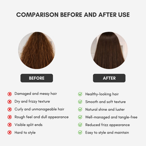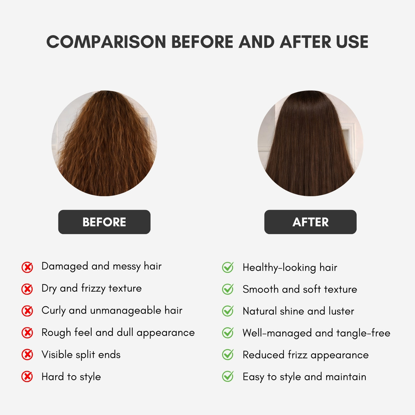 · Suitable for all hair types – reduces frizz, improves softness & shine