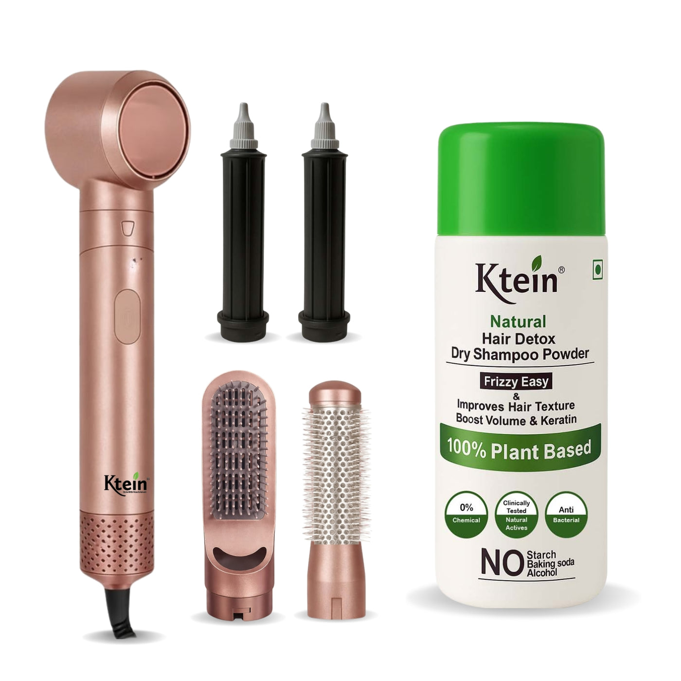 Experience effortless styling and instant freshness with the Ktein 5-in-1 Pro Multifunctional Hot Air Hair Styler combined with Ktein Natural Hair Detox Dry Shampoo Powder (25 gm). The 5-in-1 styler features multiple interchangeable attachments, including dryer comb, round volumising brush, firm brush and long suction curling barrels. The easy twist-and-lock attachment system allows seamless switching between styles, helping you achieve salon-style looks at home. The Natural Hair Detox Dry Shampoo Powder is a 100% plant-based formulation designed to absorb oil, refresh scalp, reduce frizz and improve hair texture. Ideal for no-wash days, it helps add volume and keeps hair looking clean and fresh without water. This combo is perfect for everyday styling, quick hair refresh, travel use and gifting.Â