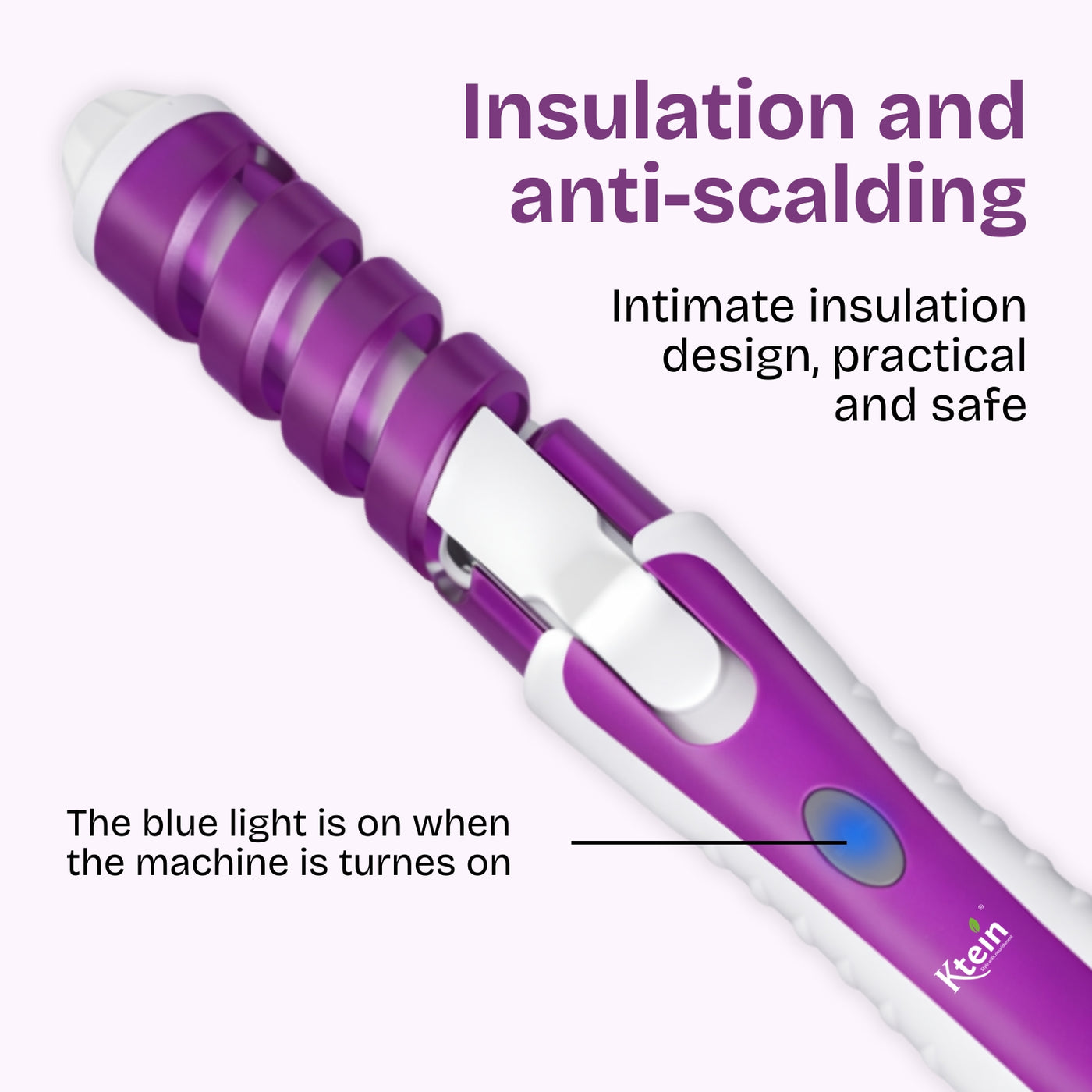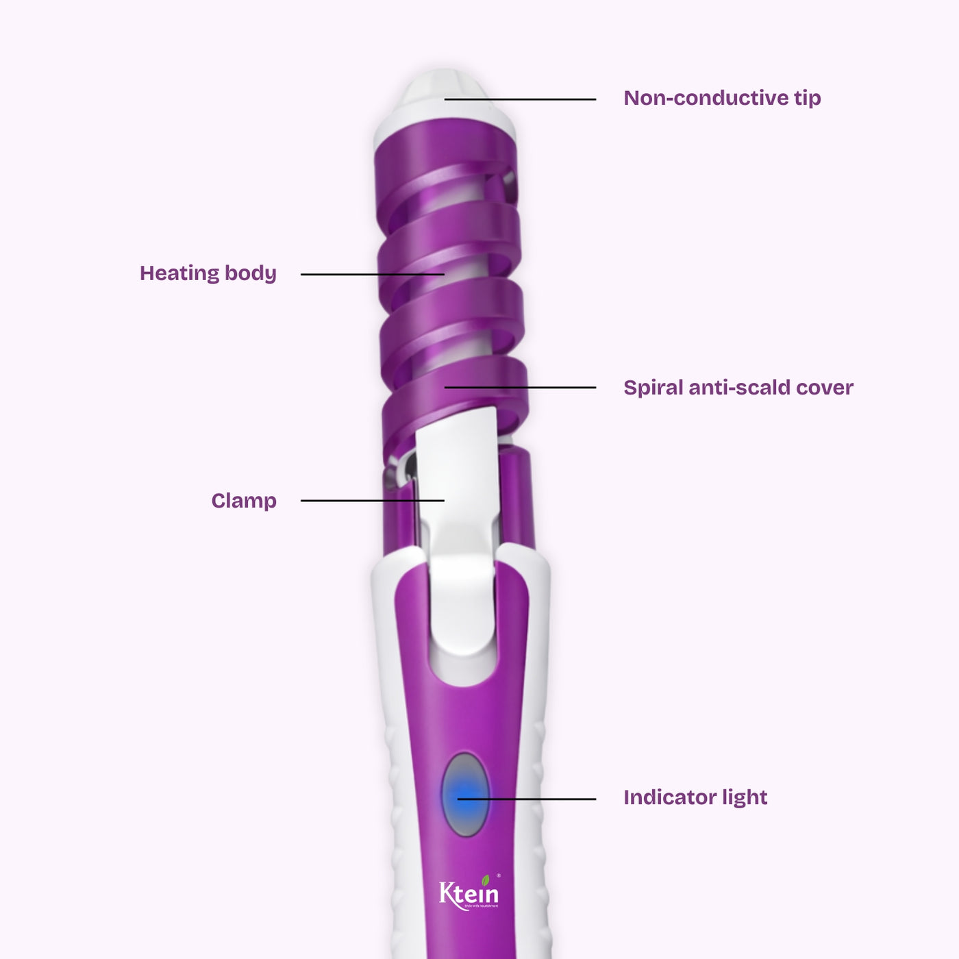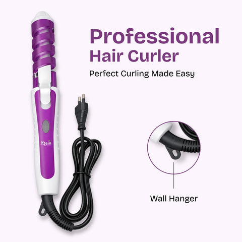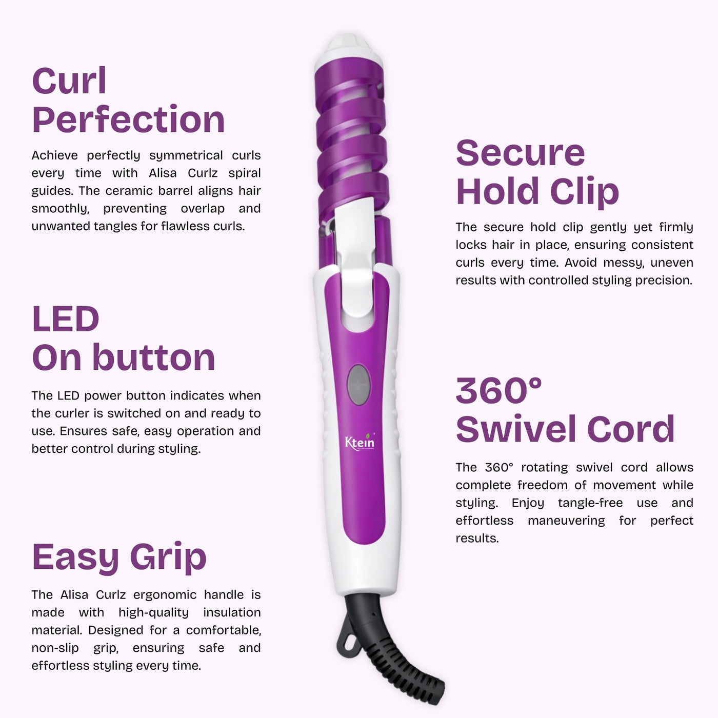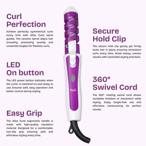 The Ktein Professional Hair Curler features a ceramic heating body combined with a spiral curl guide that aligns hair smoothly along the barrel. This design ensures even heat distribution and consistent curl formation. The spiral anti-scald cover acts as a protective layer, reducing the risk of accidental burns, while the cool-touch tip allows safer handling during styling. A secure clamp mechanism holds hair firmly yet gently, preventing slippage and uneven curls. The LED indicator button provides visual confirmation when the curler is powered on, enhancing safety and ease of use. The 360-degree rotating swivel cord ensures uninterrupted styling without cable twisting.