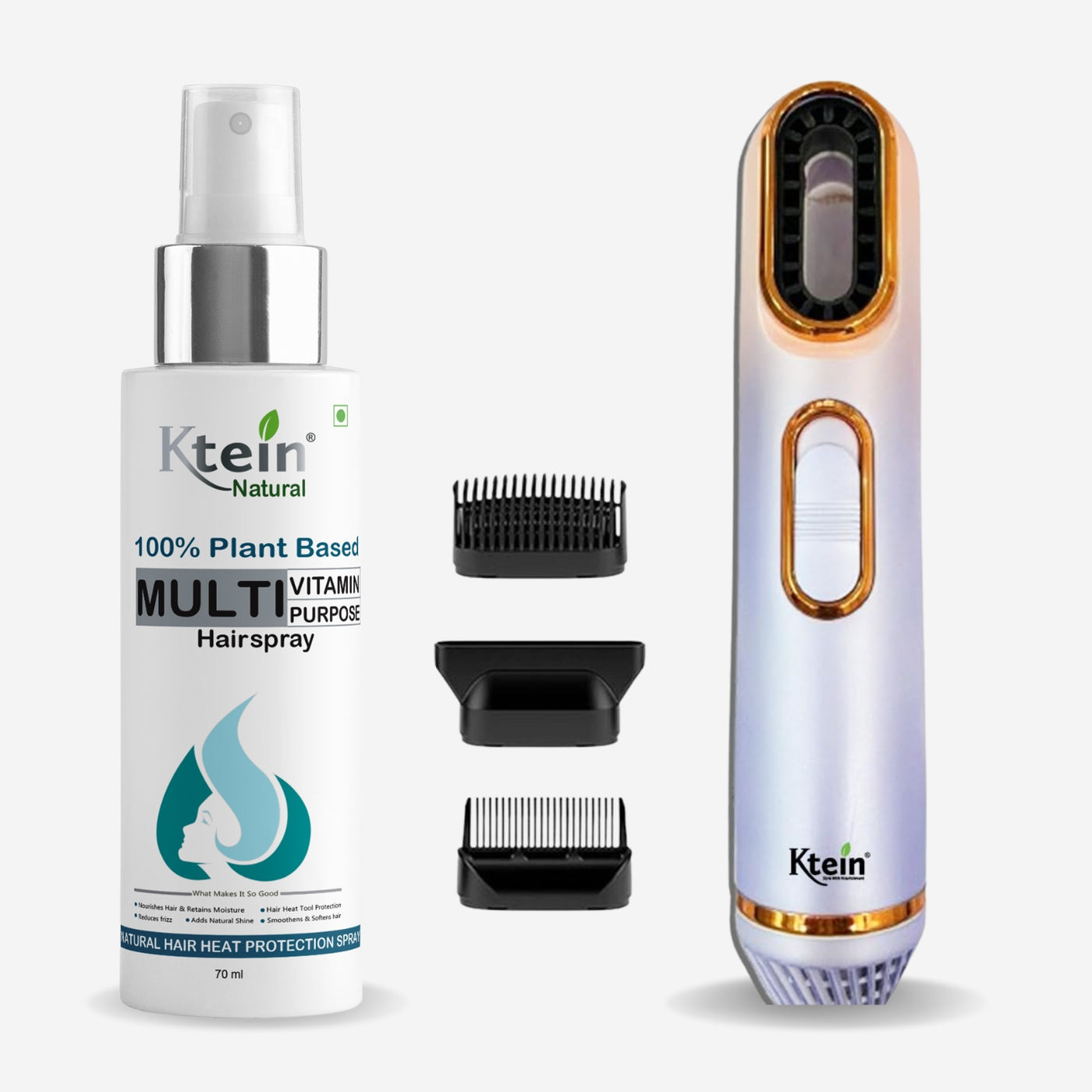 Experience effortless styling with nourishment using the Ktein Pro 3-in-1 Electric Hair Dryer & Multi-Vitamin Spray Combo. This advanced combo pairs a multi-functional electric hair dryer & styler with Ktein 100% Plant-Based Multi-Vitamin Hair Spray, delivering salon-like results with daily hair care protection. The 3-in-1 electric dryer comes with interchangeable attachments for drying, smoothing, and styling, offering flexible airflow and controlled heat for all hair types. The multi-vitamin spray, enriched with plant actives, vitamins, and heat-protection technology, shields hair from damage, reduces frizz, and boosts shine. Together, this combo ensures faster styling, healthier strands, and long-lasting smoothness — perfect for everyday grooming and styling routines. ✓-Complete dry + style + protect hair combo